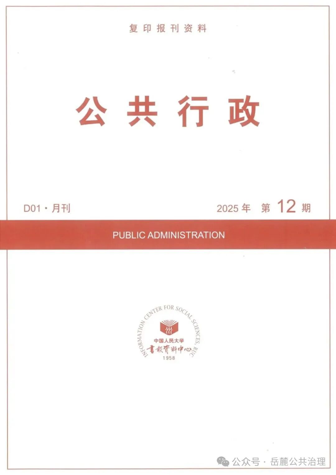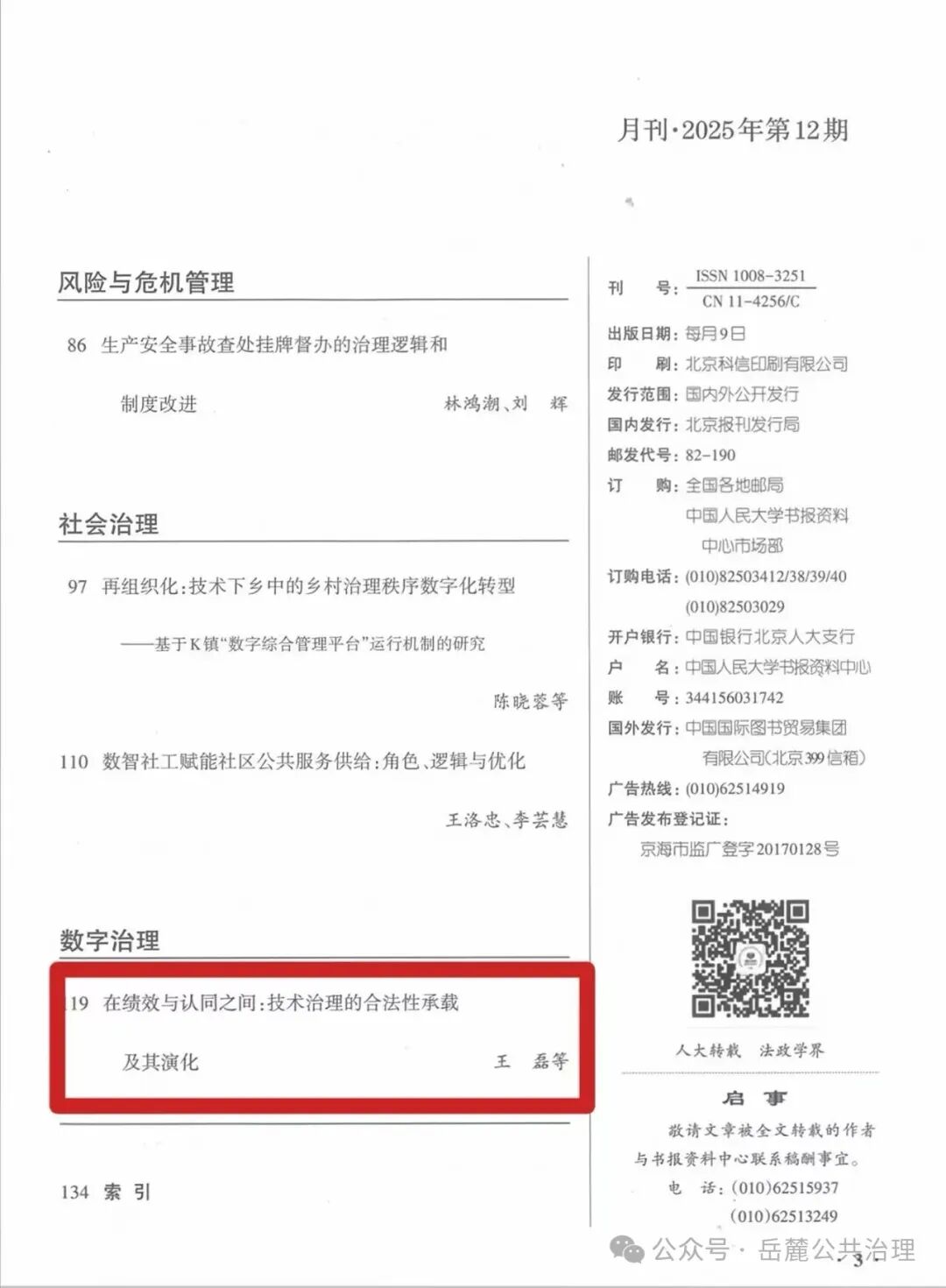 《岳麓公共治理》2025年第2期文章《在绩效与认同之间:技术治理的合法性承载及其演化》(作者:王磊,杨茜钥,王小芳),被《人大复印报刊资料 · 公共行政》2025年第12期全文转载。