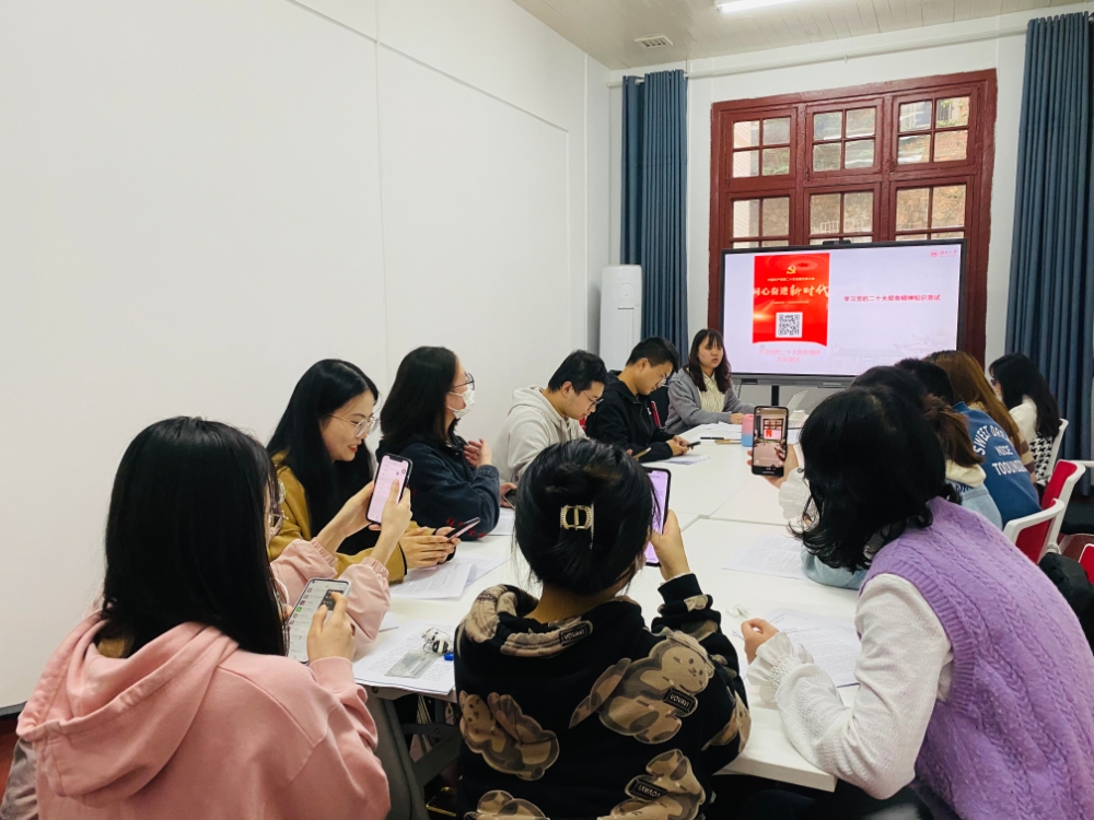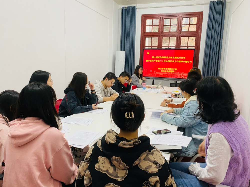 硕士研究生第四党支部在学院214室开展本月主题党日活动暨中国共产党第二十次全国代表大会精神专题学习,会议由支部书记罗欢主持。