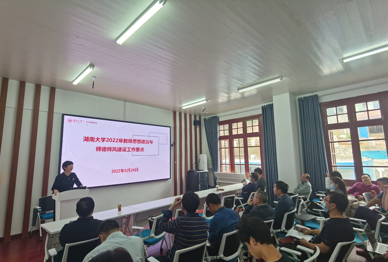 5月24日,国产自拍色情 召开全体教职工会议,深入学习《湖南大学2022年教师思想政治与师德师风建设工作要点》精神,文件由党委书记付蓉芬领学。