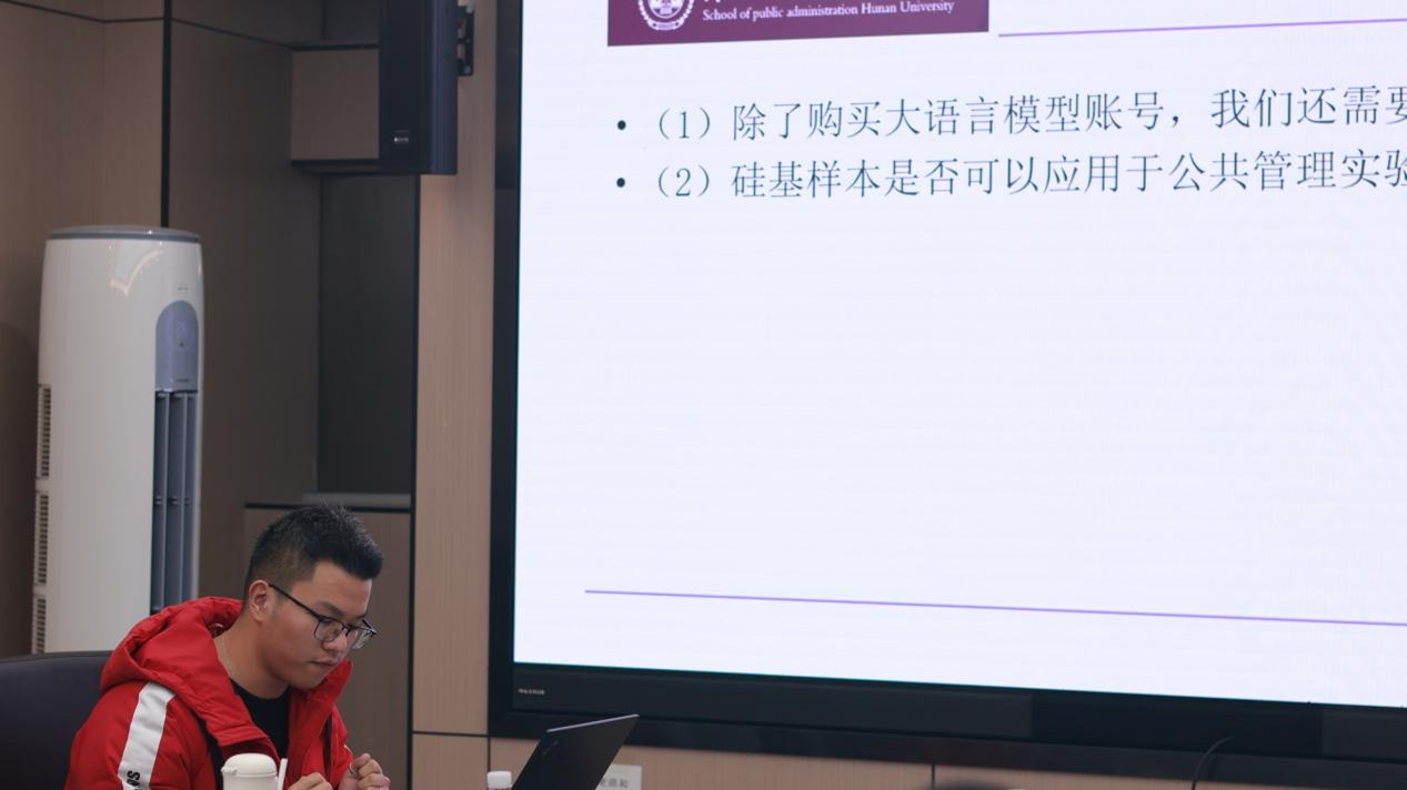工作坊汇报环节中,张文望围绕论文的研究问题、方法设计与主要发现进行了系统阐述。汇报首先从公共管理实验研究的现实需求出发,提出核心追问:大语言模型生成的“硅基样本”能否用于公共管理行为实验,若要使用,怎样的实验流程与提示词设计才能保证结果更可靠、更可比。