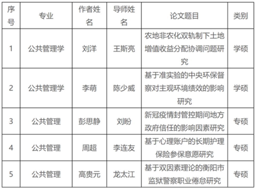 研究生学术创新取得突破。2024级硕士生周华宇以通讯作者在公共管理国际顶刊《Public Administration》发表论文。5篇学位论文获评湖南省优秀硕士学位论文,其中学术硕士2篇、专业硕士3篇。