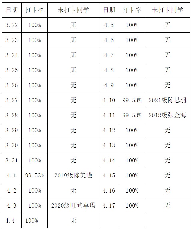 本科生做到了23天按时打卡率100%,齐心协力共抗疫情,整体情况很好。在此过程中,助理辅导员、各年级班级学生干部勇于担当,同学们积极配合,表现出了公管学子的优秀素养。同时,仍有四位同学因一时疏忽未按时打卡(名单见附表),特此通报。