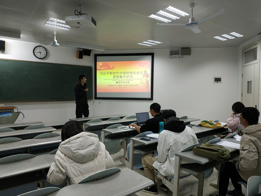 2019级硕士研究生党支部在财院校区水上教学楼610教室,召开习近平新时代中国特色社会主义思想集中学习座谈会。会议由支部书记郑朝阳主持,学院党务与人才培养办公室主任兼研究生辅导员杨锦滔老师出席会议,支部全体党员共同参与讨论学习。