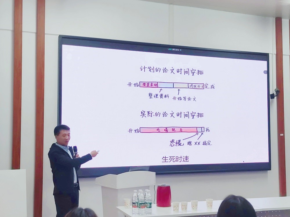 杜亚斌老师先以幽默的方式跟大家探讨论文的时间安排,再从“正确认识学术研究”话题入手,就什么是研究问题、什么是好的研究问题谈了自己的看法和见解。随后,又从引言导入、文献综述、理论分析、研究方法、结论建议五个方面对毕业论文写作中的常见问题和写作技巧进行了剖析和讲解,并结合正反两方面的写作案例、自身的写作经验与同学们进行了重点分享与互动交流。