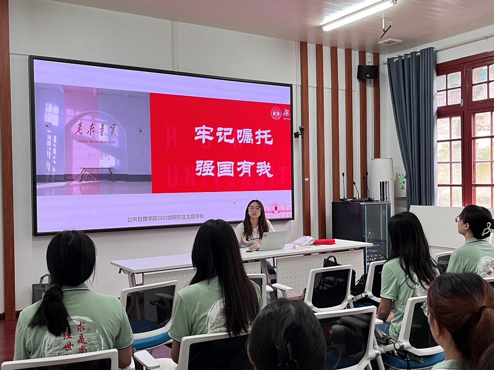 2023级研究生助理辅导员林子如主持,2023级研究生参加,本次主题班会旨在引导学生明校史校情,承接总书记嘱托,牢记使命,不忘初心。