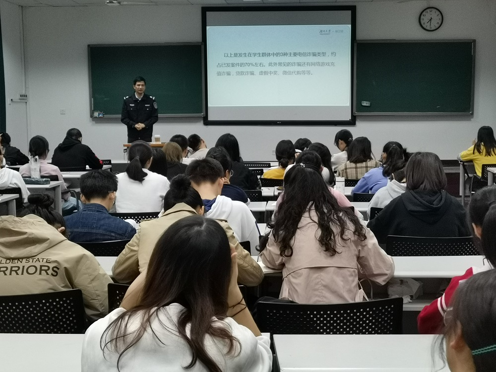 朱老师从人生安全、财产安全、消防安全、交通安全、国家安全五个方面向同学们详细介绍相关安全常识,结合自己多年的实际经验、当前校园安全现状,他深刻剖析安全问题出现的原因,提出科学的防范应对措施,给予同学们必要的提醒与帮助,其幽默诙谐、妙趣横生的语言得到大家的一致好评。讲座最后,朱老师列出校内各应急处置部门电话号码,他表示,希望同学们能一直平安、快乐地在大学里学习与生活。